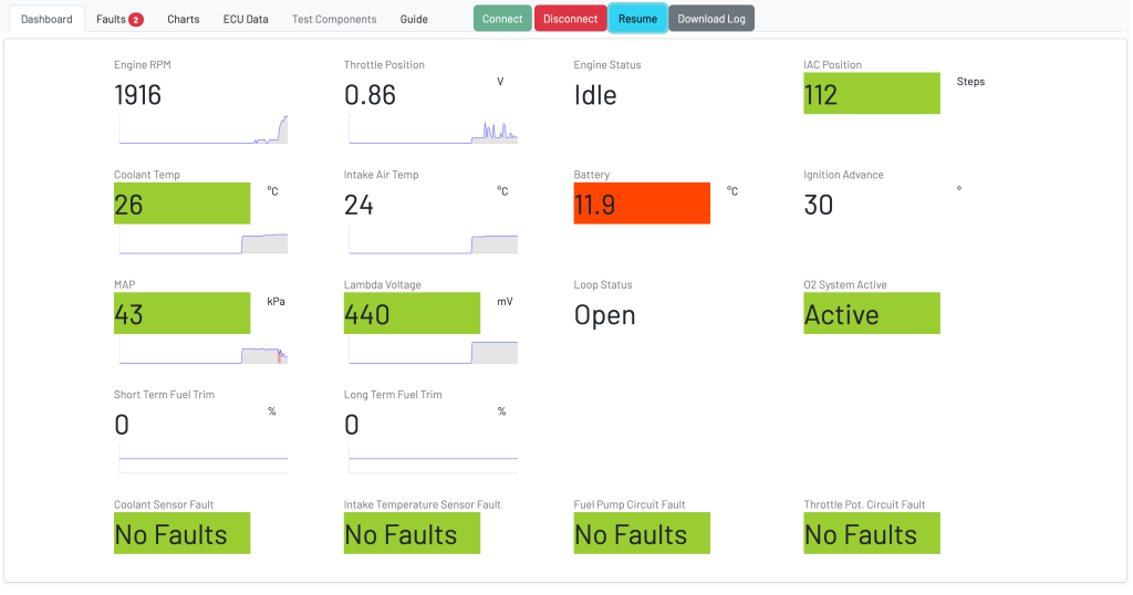 MemsFCR connects to your MEMS ECU via a special diagnostic cable that can purchased on eBay. All known ECU data parameters are displayed along with any faults that have been detected. All data can be downloaded as a CSV file for easy analysis using Excel or Google Sheets.