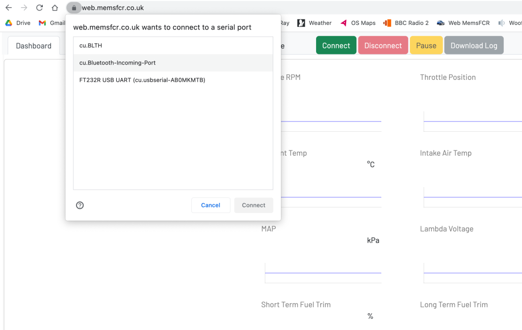 - Click on CONNECT. you will be prompted to select the serial port. This will show as FT232R USB UART or on the desktop application, /dev/cu.usbserial-FTxxxxxx